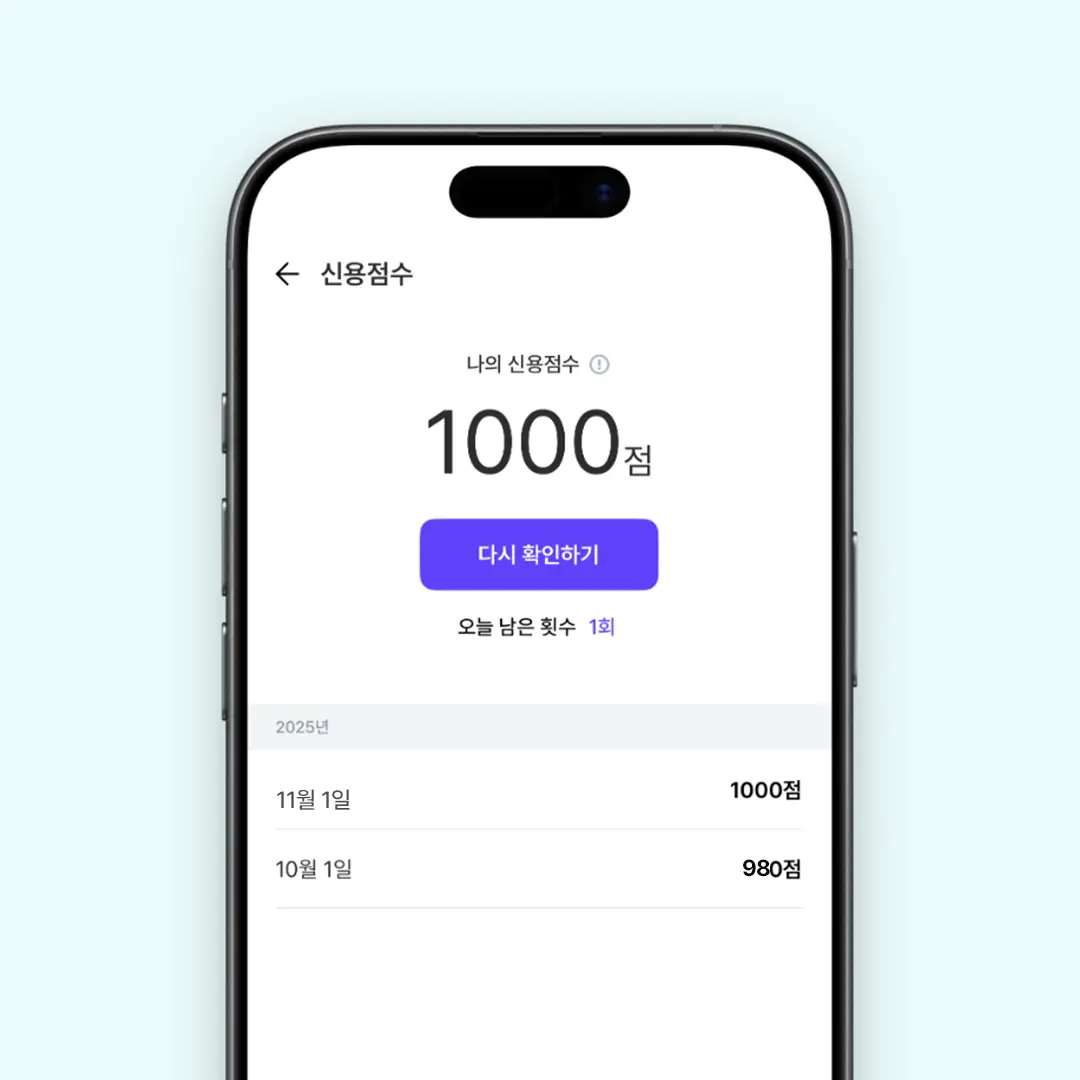 [나] → [신용점수] 메뉴로 들어가 ‘다시 확인하기’를 한 번 더 진행해 주세요.재조회를 해야 새로운 점수가 반영되고, 그에 맞게 스테이지 한도도 조정될 수 있어요.