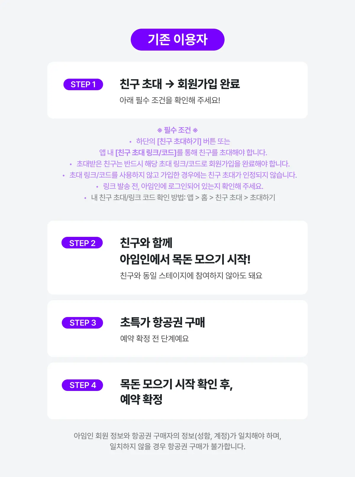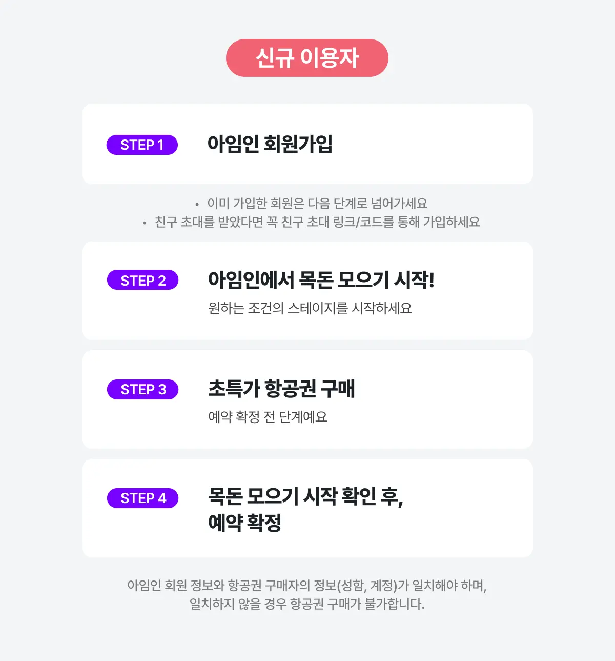 아임인 회원 정보와 항공권 구매자의 정보(성함, 계정)가 일치해야 하며,