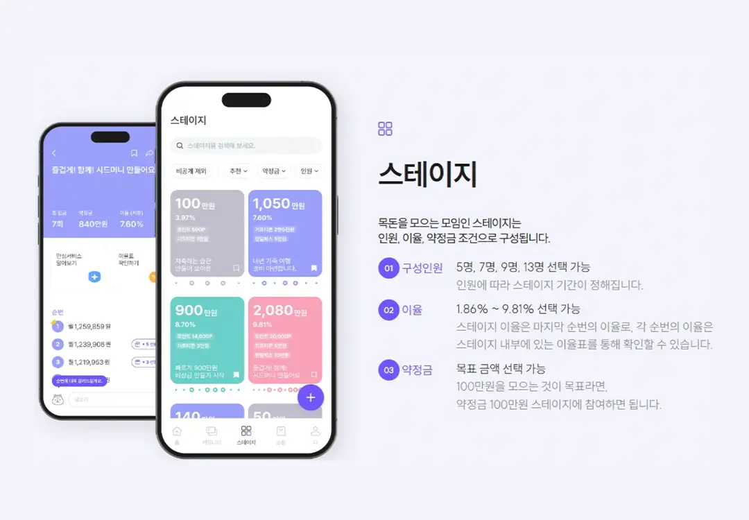 스테이지라는 그룹에 여러 사용자가 함께 참여해 정해진 약정금을 매달 납부하고, 선택한 순번에 따라 목돈을 받는 구조로 운영됩니다.